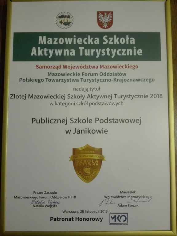 Złota Mazowiecka Szkoła Aktywna Turystycznie 2018