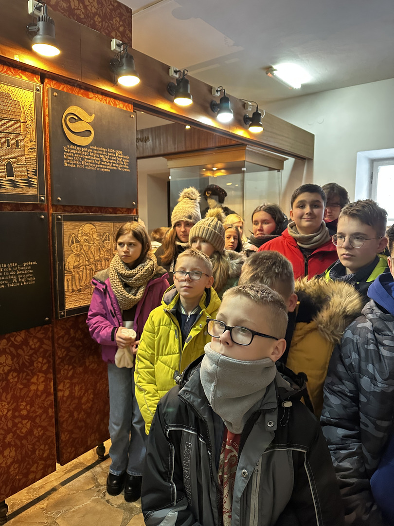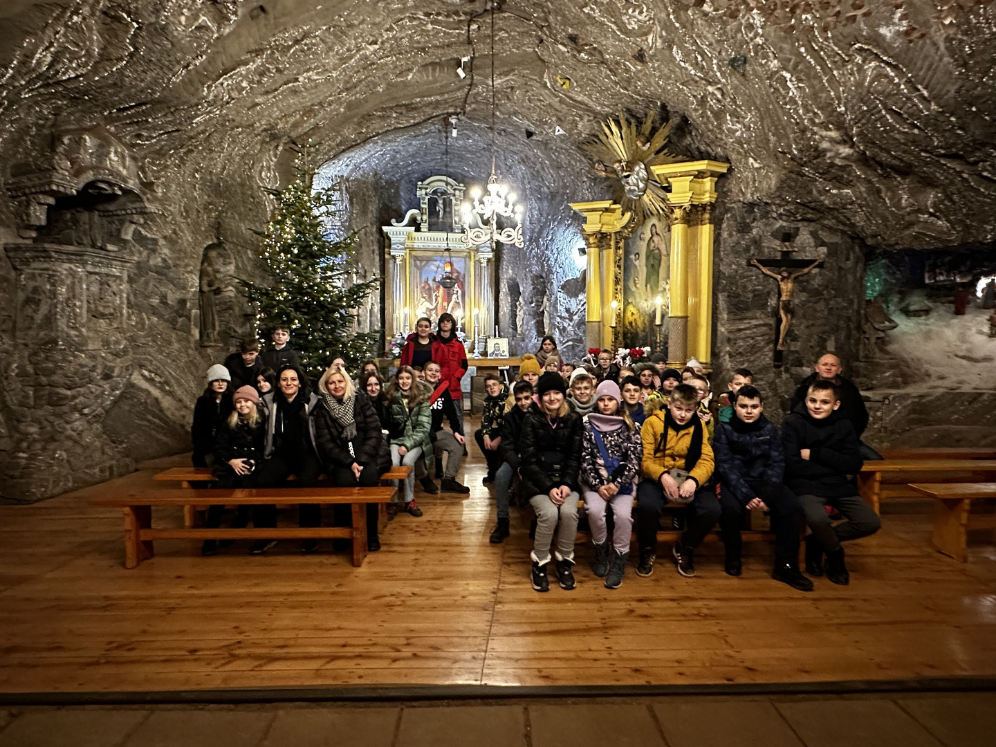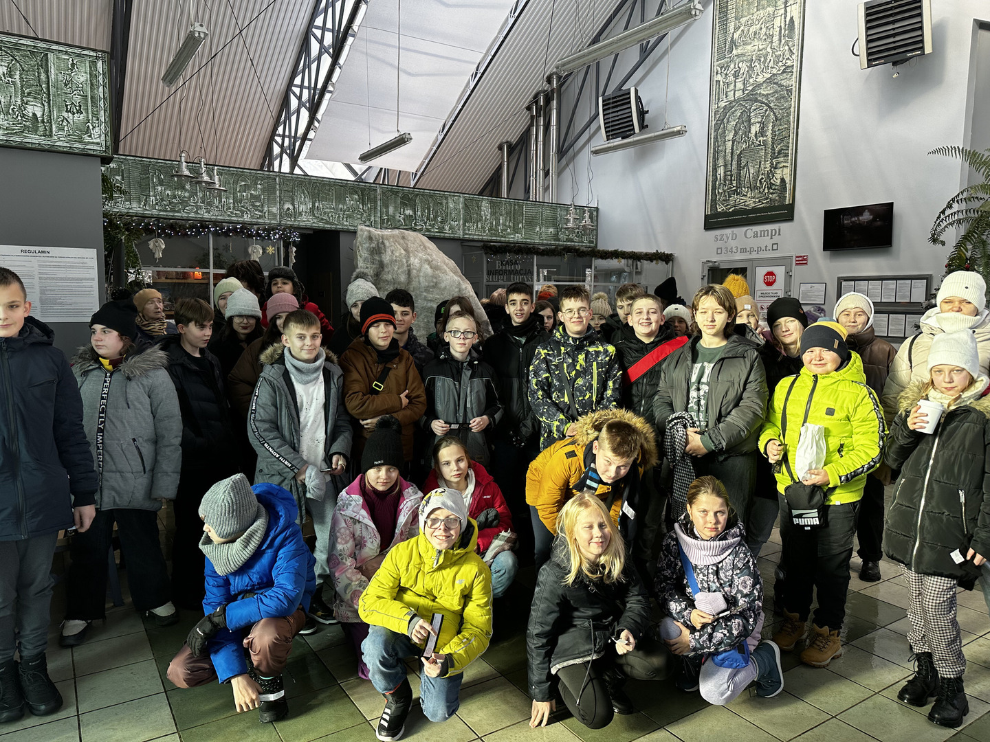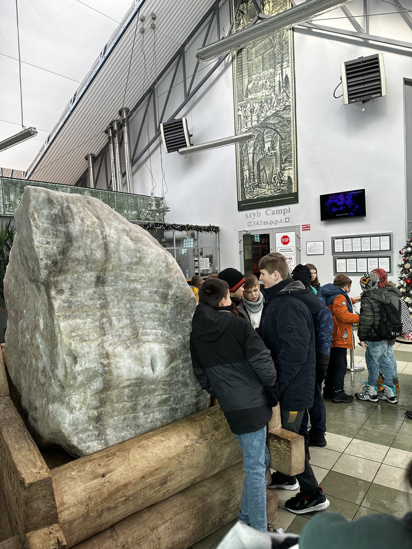 Następnie, wyruszyliśmy do Kopalni Soli „Bochnia”. Początki bocheńskiej kopalni jako zakładu wydobywczego sięgają roku 1248.To właśnie z bocheńską kopalnią związana jest legenda o pierścieniu św. Kingi. W roku 1981 kopalnię wpisano do rejestru zabytków, a w 2013 roku na listę światowego dziedzictwa UNESCO. Jako jedyna kopalnia w Polsce posiada podziemną przeprawę łodziami. Jedną z atrakcji był przejazd podziemną kolejką. Dużym zainteresowaniem uczniów cieszyła się Ekspozycja Multimedialna, dzięki której poznali historię wydobycia soli, trud górniczej pracy, a także historię Polski. Kopalnia zrobiła na nas niesamowite wrażenie.