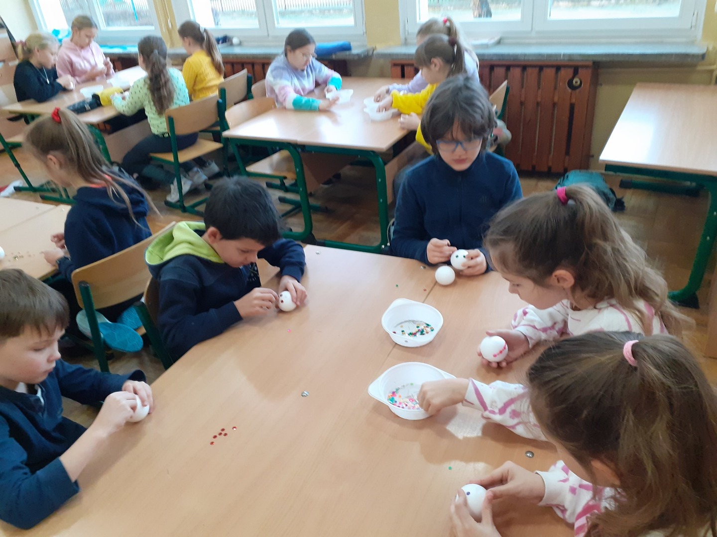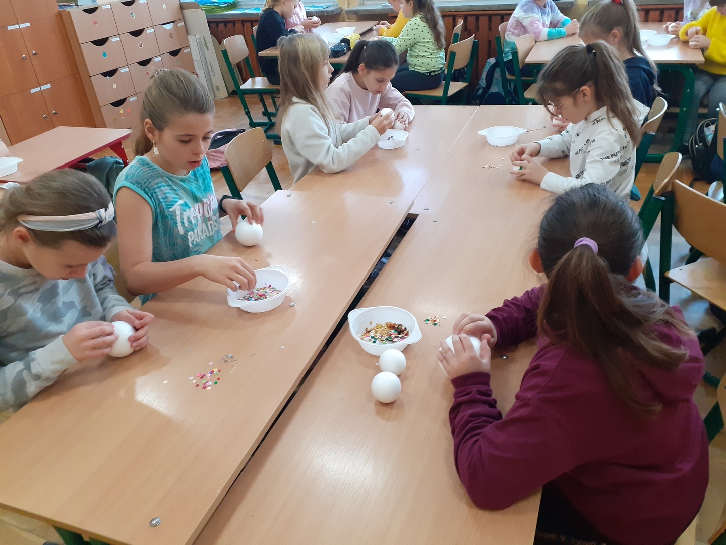 Drugie zajęcia polegały na ozdobieniu kolorowymi cekinami bombek styropianowych. Wszystkie bombki posłużyły do udekorowania choinki szkolnej.