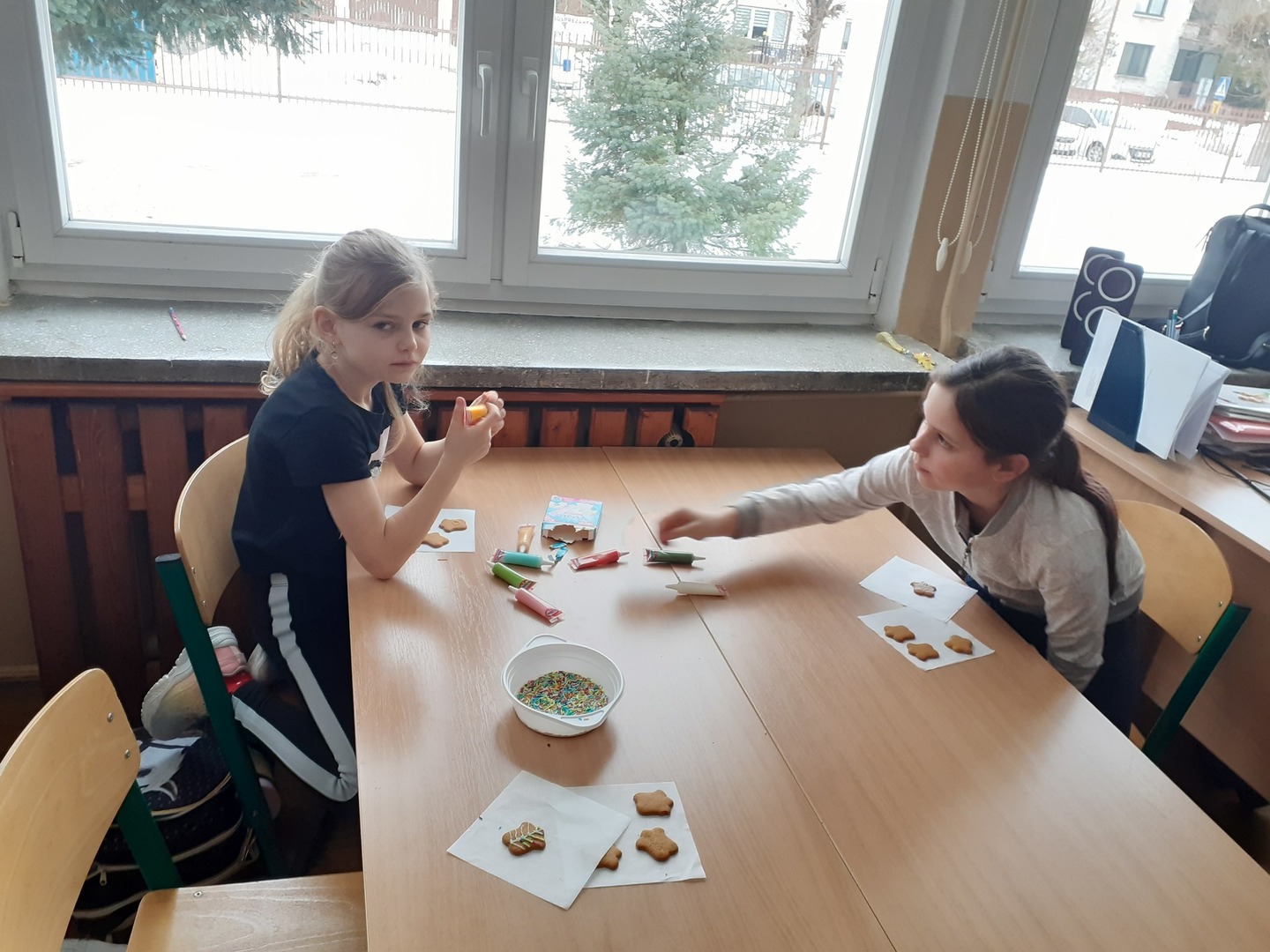 W trakcie trzecich zajęć ozdobiono kolorowymi pisakami cukrowymi pierniki. Dzieci przyklejały cukrowe gwiazdki, perełki oraz serduszka. Pierniki zostały przekazane rodzicom w ramach upominku świątecznego.