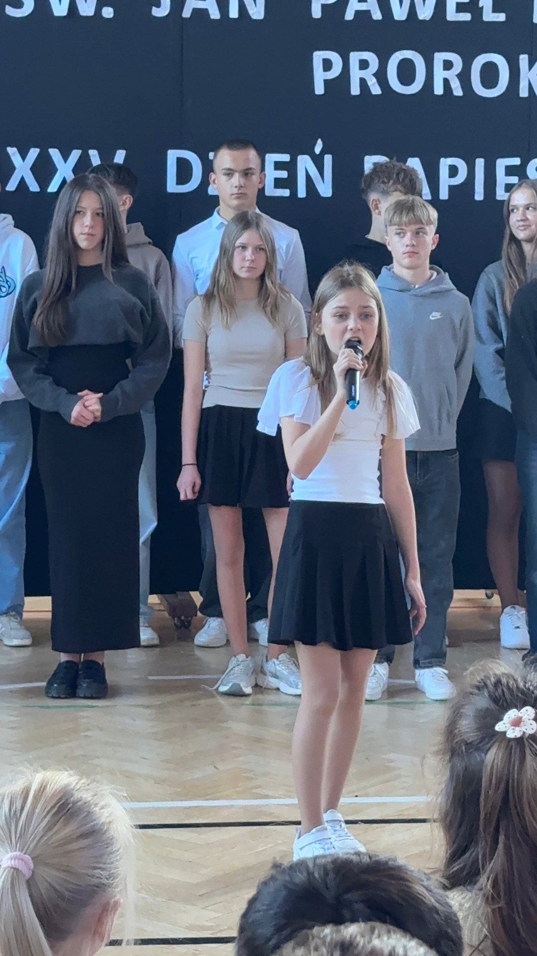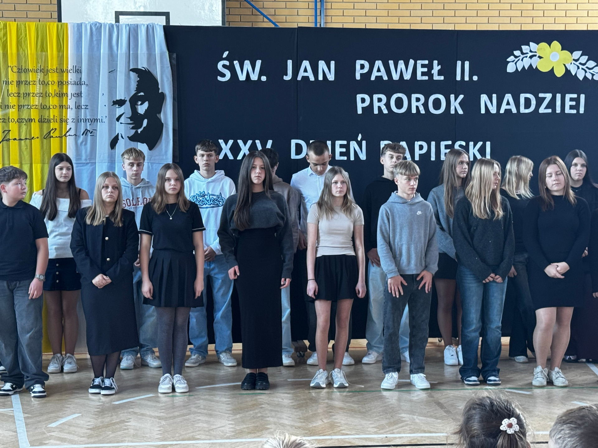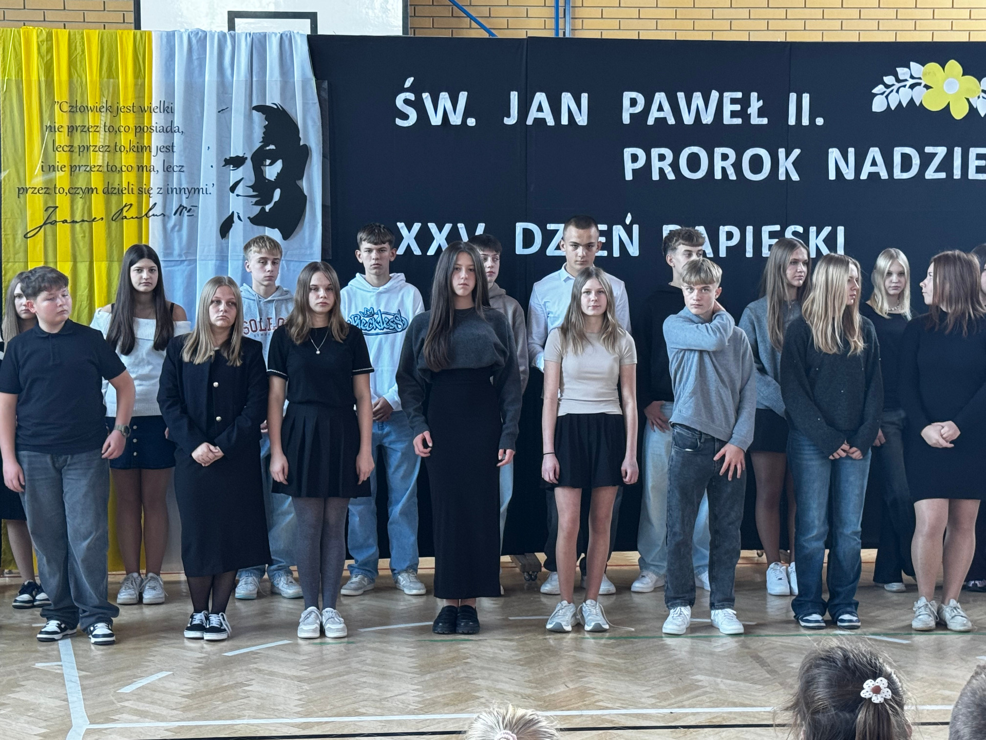 W naszej szkole odbył się uroczysty apel z okazji XXV-lecia Dnia Papieskiego, przygotowany przez uczniów klasy VIII. Scenariusz uroczystości opracowano na podstawie materiałów Fundacji „Dzieło Nowego Tysiąclecia”, która od 25 lat upowszechnia nauczanie i dziedzictwo św. Jana Pawła II.
